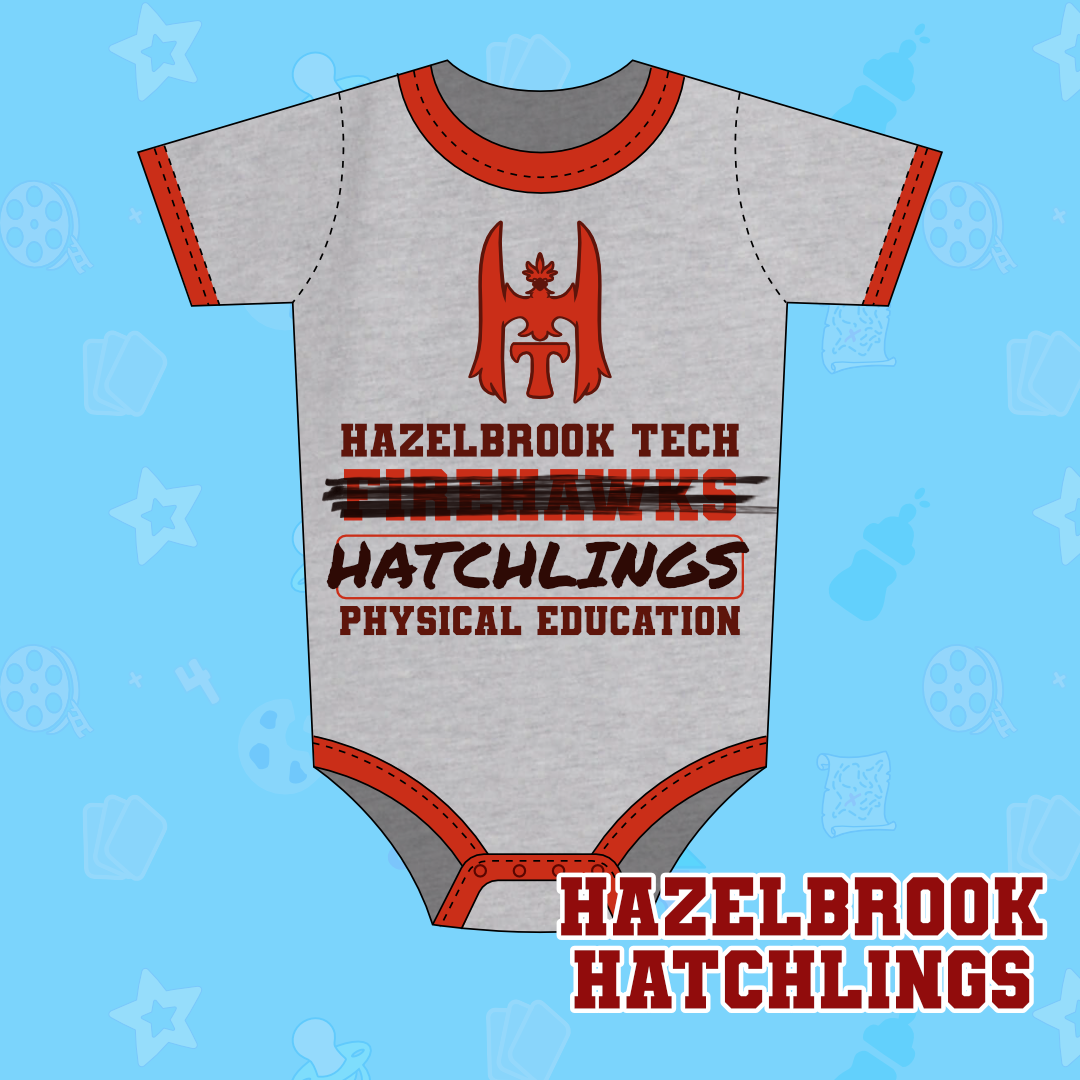 Hazelbrook Hatchlings onesie, our set 4 premiere onesie, designed by Kit. Regression is no excuse to skip gym class, get your onesie on and get some hustle with your rustle!
